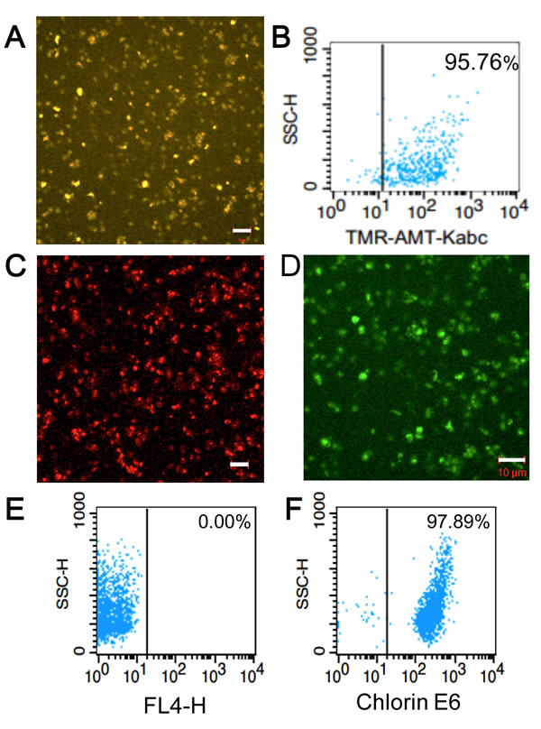 Figure 1: Characterization and analysis of tumor-targeting platelets. A. Confocal fluorescence image showing the accumulation of TMR-KabC in a field of human platelets. Bar = 10 µm. B. FACS analysis of TMR-KabC loading of purified human platelets recorded 24-hours after incubating with 108 platelets/ml with TMR-KabC at 5 µM. C. Confocal fluorescence image of the intrinsic fluorescence of EPI in KabC-platelets. Bar = 10 µm. D. Confocal fluorescence image of KabC-platelets loaded with CFDA. CFDA is de-esterified within the platelet to produce a fluorescent di-anionic fluorescein probe that is trapped in the cytosol. Measure bar = 10 µm. E. FACS analysis of KabC-platelets without any probe labeling. F. FACS analysis of KabC-platelets loaded with a 30µM solution of chlorin-e6 in KabC-platelets and recorded 24-hours later.