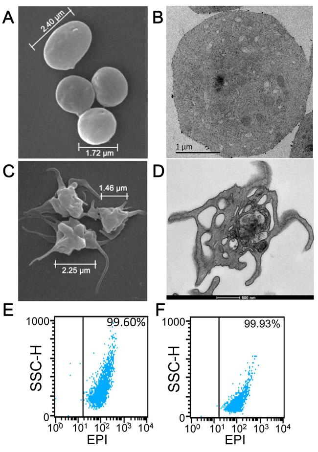 Figure 2: Characterization of KabC-platelets. A. SEM image of a KabC-platelets previously exposed to thrombin (1U/ml). B. TEM image of a single KabC-platelet previously exposed to thrombin (1U/ml). C. SEM image of human platelets without KabC previously exposed to 1 U/ml thrombin. D. TEM image of a single human platelet without KabC previously exposed to 1 U/ml thrombin. FACS analysis of light-scattering for KabC-platelet loaded with EPI E. before, and F. after an exposure to 1U/ml thrombin.