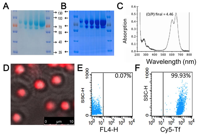Figure 3: Characterization of transferrin conjugates and their coupling to KabC-platelets. SDS-PAGE images of transferrin labeled with Cy5 and PDM showing A. the unstained gel with the light blue color originating from absorption of transferrin linked Cy5-probes, and B. the same gel stained with Coumassie Blue. Cy5-labeled transferrin shows up as band at ~80kD in both cases. C. Absorption spectrum of the transferrin of Cy5/PDM. Analysis of the absorption data at 650nm (Cy5) and 280 nm (transferrin) is used to calculate a labeling ratio of 4.5 Cy5 molecules per transferrin molecule. D. Overlay of the phase-contrast and Cy5-fluorescence images of KabC-platelets coupled with transferrin conjugated to Cy5/PDM. Bar = 10 µm E. FACS analysis of the background fluorescence of KabC-platelets measured in the Cy5-emission channel. F. FACS analysis of the optimized loading condition developed to couple transferrin conjugated to Cy5/PDM to thiol-containing KabC-platelets measured in the Cy5-emission channel.
