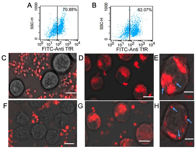 Next we used confocal fluorescence microscopy and FACS analysis to quantify interactions between Cy5/transferrin-coupled KabC-platelets and RPMI8226 cells and K562 cells. We confirmed each of these cell lines over-express the transferrin receptor [13] by incubating cells with a FITC-labeled primary antibody against the human transferrin receptor (Figure 4A, 4B) followed by FACS analysis - more than 70% of RPMI8226 cells, and > 62% of K562 cells exhibited a FITC-fluorescence signal that exceeded the maximum background signal of unlabeled cells (indicated by the vertical lines in Figure 4A, 4B). Fluorescence images of KabC-platelets coupled with Cy5 alone, or Cy5 and transferrin were recorded after an 8-hour incubation with RPMI8226 cells (Figure 4C, 4D, 4E), or K562 cells (Figure 4F, 4G, 4H). The overlap of the Cy5-fluorescence and bright-field images for control platelets (Cy5-coupled KabC-platelets without transferrin) did not reveal any significant binding of platelets to RPMI8226 cells or K562 cells (Figure 4C and 4F respectively). On the other hand, a significant number of KabC-platelets surface-coupled with transferrin and Cy5 were found on RPMI8226 cells or K562 cells (Figure 4D, 4E and 4G, 4H respectively). These studies suggest that repurposed platelets bind specifically to RPMI8226 cells, and K562 cells by interactions between transferrin molecules on the platelet membrane, and the large number of transferrin receptors on the surface of these cells. The Cy5-fluoresence on RPMI8226 cells and K562 cells remained spotty even after a long period of incubation, which might indicate the large diameter of bound platelets prevents their internalization by endocytosis [22].