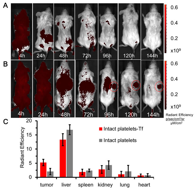 Next we characterized the in vivo distributions of KabC-platelets surface-coupled with Cy7 and transferrin, or platelets without transferrin in immuno-compromised mice. RPMI8226 cells were injected sub-cutaneously on the back of NOD/SCID mice [14-16]. Myeloma xenotransplants were visible in mice around 2-4 weeks after injecting RPMI8226 cells. RPMI8226 cells were used for these studies as they over-express the transferrin receptor [13]. Moreover, previous studies have employed sub-cutaneous myeloma xenotransplants derived from injections of RPMI8226 cells to study the effectiveness of antibody-based tumor therapies [14-17]. NOD/SCID mice were used as hosts for the myeloma xenotransplant described in our studies - animals homozygous for the SCID mutation have impaired T and B cell lymphocyte development, while the NOD background results in deficient natural killer (NK) cell function. Myeloma xenotransplants grow more efficiently in NOD/SCID mice as a result of their immune deficiency, which facilitates the growth of sub-cutaneous and intra-cranial injected RPMI8226 cells. The average volume of xenotransplants that developed after subcutaneous injection of RPMI8226 cells reached 80~100 mm3 after 7-10 days , and increased to ~2000 mm3 by ~21 days.