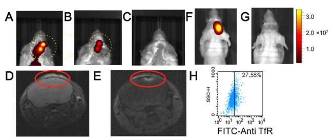 Figure 6: In vivo NIR-fluorescence imaging of platelets in control mice, and in mice bearing intra-cranial myeloma xenotransplants. Cy7-fluorescence images of mice bearing intra-cranial xenotransplants that formed after injecting RPMI8226 cells. The mice (n = 3) were injected with Cy7/transferrin coupled KabC-platelets on day-5 and the Cy7-fluorescence imaged after 24-hours. Cy7-fluorescence images from two of these mice are shown in A. and B. show structured fluorescence from their crania. C. Cy7-fluorescence image of a control mouse without xenograft injected with Cy7/transferrin coupled KabC-platelets. The look up tables presented has units of radiant efficiency (photons.sec-1.cm-2.steradian-1) / µW.cm2. The mouse shown in Figure 6A was imaged by MRI on day-8; D. T1 image recorded before and, E. after injecting Magnevist in the tail vein. In a second control group, mice were injected with U87 cells transfected with RFP to allow for in vivo imaging of neuroglioblastoma xenotransplants. F. RFP fluorescence from a representative mouse in this group showing the locus of the neuroglioblastoma xenotransplants. G. corresponding Cy7-image of the same mouse injected with KabC-platelets coupled with transferrin and Cy7. Cy7 emission was not detected in the brain of this or other mice in the group. H. FACS analysis of U87 cells stained directly with a FITC-conjugated antibody against human transferrin receptor showing the majority of U87 cells express low levels of transferrin receptor.