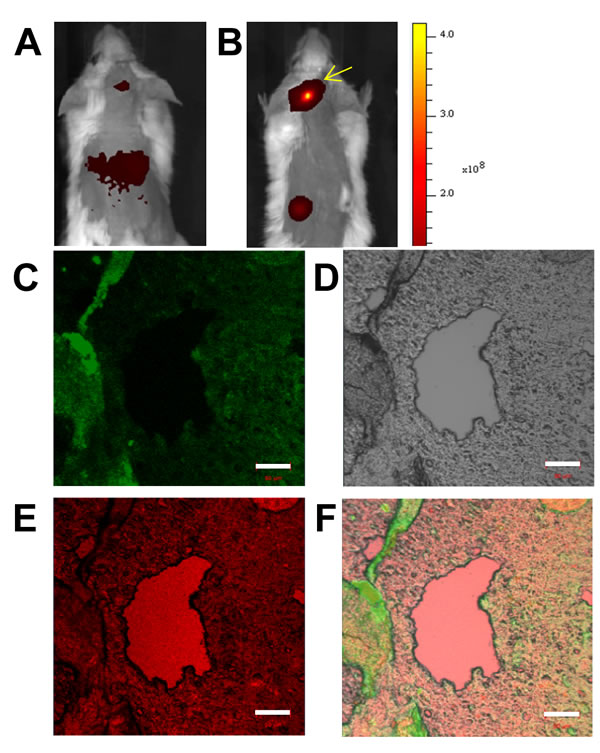 Figure 7: Immuno-histochemical imaging and analysis of RPMI8226 cell-derived xenotransplants. Tumor slices excised from mice injected with KabC-platelets coupled with transferrin and chlorin e6. Measurement bars in all images is 50 µm: A. in vivo red-fluorescence image of a representative mouse bearing an intra-cranial xenotransplants that developed after injecting RPMI8226 cells and then injected with KabC-platelets loaded with chlorin e6. B. in vivo red-fluorescence image of a representative mouse bearing an intra-cranial xenotransplants that developed after injecting RPMI8226 cells and then injected with KabC-platelets coupled with transferrin and loaded with chlorin e6. C. Representative confocal fluorescence image of a FITC-labeled antibody directed against human transferrin receptor showing the distribution of RPMI8226 cells in the tumor slice. D. Bright-field image of the same tumor slice. E. Chlorin e6 fluorescence in the xenotransplant slice showing the distribution of repurposed platelets in blood vessels and tumor tissue. F. Overlay of the FITC, bright-field and red-fluorescence images showing infiltration of platelets within the xenotransplant.