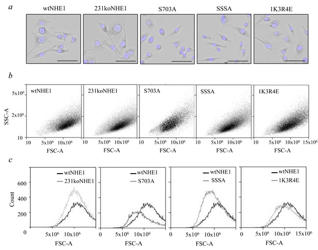 Figure 2: Comparison of morphology of mutant and wild-type NHE1-expressing MDA-MB-231 cells. The morphology of mutant NHE1 cells was compared to wtNHE1 and 231koNHE1 cells by microscopy a. and flow cytometry (b, c). a. Bright-field images showing fixed cells with Hoechst nuclear staining (blue). Scale bars represent 50 μm at 20X magnification. b. and c. Quantification of differences in cell size and granularity. b. Dot plots showing cell size (FSC-A) versus granularity (SSC-A), and c., histogram overlays of size vs. number of cells.