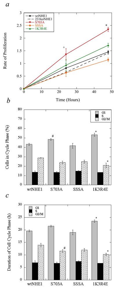 To investigate the effect of negating NHE1 activation mediated by p90RSK/14-3-3 (S703A) and ERK1/2 (SSSA), versus constitutively activating NHE1 by blocking exchanger auto-inhibition (1K3R4E), we compared the rates of proliferation between mutant NHE1 cells, cells expressing wild-type NHE1, and 231koNHE1 cells. As seen in Figure 3a, S703A cells had a significantly higher rate of proliferation compared to wtNHE1, 231koNHE1, and other mutant-containing cells at 24 and 48 hr. (+P < 0.01, *P < 0.001, N = 3). We then used laser-scanning cytometry to analyze potential differences in the progression of mutant NHE1 and wtNHE1 cells through the cell cycle. We quantified the percentage of cells in each phase of the cell cycle at a single time point 24 hr. after an equal number of cells were plated in serum-supplemented media. Here, mean integral fluorescence is proportional to DAPI-DNA binding and maximum pixel values indicate chromatin concentration [28]. We found that there were significantly more S703A cells in the first growth phase G1 compared to wtNHE1 cells (#P < 0.05, Figure 3b), while the estimated duration of the second growth and mitotic phases (G2/M) for S703A cells was much shorter than in wtNHE1 cells (#P < 0.05, Figure 3c). We also found that there were more 1K3R4E cells in G1, but fewer cells in G2/M. Similarly, the duration of G1 was longer and G2/M was shorter, respectively, in 1K3R4E cells relative to wtNHE1 cells (*P < 0.001, Figure 3b, 3c). Progression of SSSA cells through the cell cycle was comparable to wtNHE1 cells.