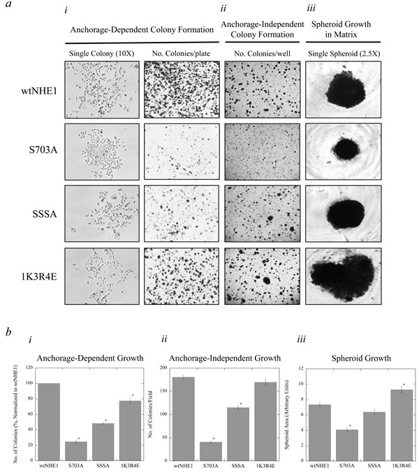 Figure 5: Colony formation and spheroid growth of NHE1 mutant cells compared to wtNHE1 cells. Cell colonization was assessed by anchorage-dependent and anchorage-independent (in soft agar) colony forming assays and spheroid growth assays in Matrigel™ matrix (a and b). a.i., Anchorage-dependent colony formation. Colony growth of wtNHE1, S703A, SSSA, and 1K3R4E cells on cell culture-treated plates was used to evaluate anchorage-dependent growth over 2 weeks, after which cells were fixed, permeabilized and stained with crystal violet. Images shown represent single colony morphology under bright-field microscopy at 10X magnification prior to staining, and the total number of stained colonies per 60 mm plate. a.ii. Anchorage-independent colony formation. As described in the Materials and Methods, colony growth of wtNHE1 and mutant NHE1 cells embedded in 0.7% soft-agar in 6-well plates was used to evaluate anchorage-independent cell colonization over 6 weeks. Images shown are a representation of the total number of colonies per well. a.iii. Spheroid growth in Matrigel™ matrix. wtNHE1 and mutant NHE1 cells were aggregated, embedded, and grown in a suspension of 5% Matrigel™ in a 96-well plate to determine their ability to form spheroids. After 7 days, cells grow and develop into one single spheroid cell cluster per well. Images shown represent a single spheroid under bright-field microscopy at 2.5X magnification. b. Graphical representation of anchorage-dependent and anchorage-independent colony formation and spheroid growth in wtNHE1 and mutant NHE1 cells. Colonies with >50 cells each for anchorage-dependent growth, and colonies with a diameter of >1 mm for anchorage-independent growth, were counted and represented graphically (b.i and b.ii respectively), as was an arbitrary comparison of the area of spheroid growth of the different cell types (b.iii) [*P < 0.001; N = 3].