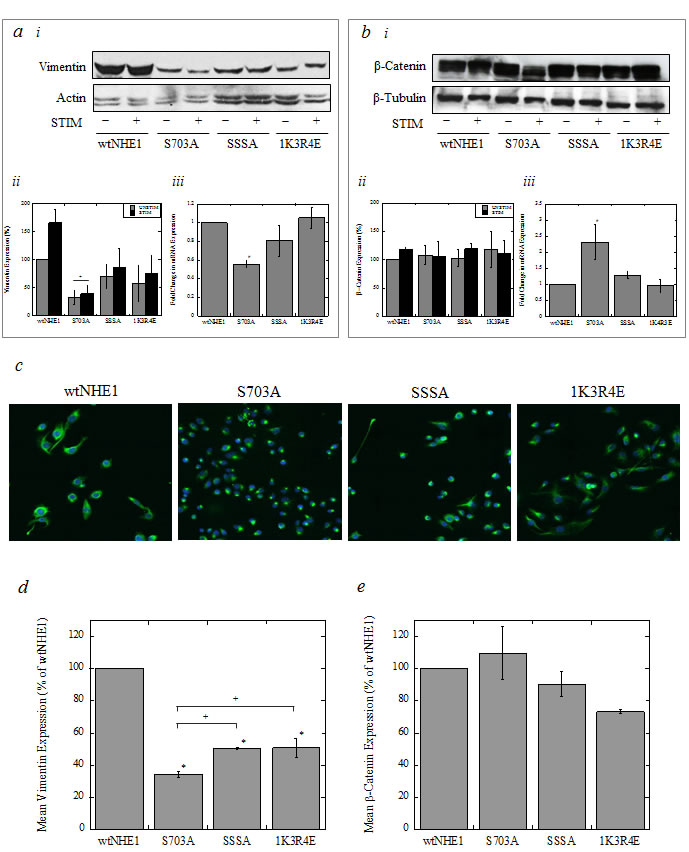 Figure 6: Expression of vimentin and β-catenin in wild-type and mutant NHE1-expressing cells. The expression of mesenchymal marker vimentin and epithelial marker β-catenin was assessed by western blot, qRT-PCR, (a, b) and laser-scanning cytometry/microscopy (c-e). a. and b. Western blot and qRT-PCR analysis of vimentin and β-catenin in cell lysates of MDA-MB-231 cells expressing wtNHE1, S703A, SSSA, and 1K3R4E. For western blot analysis, cells were cultured in either unstimulated (10% serum in complete media) or stimulated (0.2% serum) conditions for 24 hr. prior to lysis. Actin and tubulin were used as loading controls. a.i, Representative western blot showing vimentin expression, and a.ii, corresponding quantification of protein expression by densitometry. a.iii, mRNA expression of vimentin determined by qRT-PCR. b.i, Representative western blot showing β-catenin expression, and b.ii, corresponding quantification of protein expression by densitometry. b.iii, mRNA expression of β-catenin determined by qRT-PCR. Protein expression of vimentin (a) or β-catenin (b) expression by western blot was compared with levels in the unstimulated wtNHE1 cell lysates [+P < 0.01, N = 3]. Vimentin and β-catenin expression at the transcriptional level (mRNA) was compared to GAPDH [#P < 0.05, N = 5] in unstimulated cells. c. Pictorial representation of vimentin fluorescence (green) and DAPI nuclear staining (blue) in fixed, unstimulated wtNHE1, S703A, SSSA, and 1K3R4E cells by laser-scanning microscopy at 40X magnification. d. and e. Quantification of vimentin (d) and β-catenin (e) protein expression in unstimulated conditions as a measure of mean integral fluorescence [+P < 0.01, *P < 0.001, N = 3].