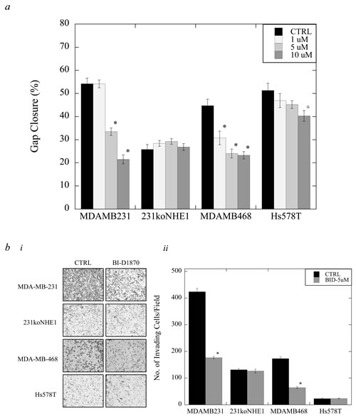 Figure 8: Effect of BI-D1870 on migration and invasion in MDA-MB-231, MDA-MB-468, and Hs578T cells, compared to 231koNHE1 cells. Cell migration was assessed by wound-healing assays (a), and cell invasion was a measure of the number of cells invading through Matrigel™-coated transwell inserts (b). a. Effect of BI-D1870 on cell migration. Rate of migration in MDA-MB-231, 231koNHE1, MDA-MB-468, and Hs578T cells treated with 1, 5 or 10 µM BI-D1870 over 24 hr. [+P < 0.01, *P < 0.001, N = 4]. b. Effect of BI-D1870 on cell invasion. b.i, Pictorial representation of invading cells (bright-field microscopy at 10X magnification). b.ii, Rate of invasion of MDA-MB-231, 231koNHE1, MDA-MB-468, and Hs578T cells treated with 5 µM BI-D1870 over 24 hr. [*P < 0.001, N = 4].