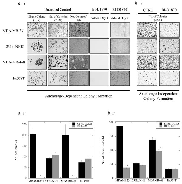 Figure 9: Effect of BI-D1870 on colony growth in MDA-MB-231, MDA-MB-468, and Hs578T cells, compared to 231koNHE1 cells. Cell colonization was assessed by anchorage-dependent and anchorage-independent (in soft agar) colony forming assays. a. Effect of BI-D1870 on anchorage-dependent colonization. a.i, Images shown represent single colony morphology under bright-field microscopy at 10X magnification, multiple colonies at 2.5X magnification, and the total number of colonies per 60 mm plate after staining with crystal violet. 5 µM BI-D1870 was added to cells after seeding either on Day 1 or Day 7. a.ii, Graphical representation of anchorage-dependent colony growth of MDA-MB-231, 231koNHE1, MDA-MB-468, and Hs578T cells when 5 µM BI-D1870 was added on Day 7 compared to untreated DMSO controls [*P < 0.001, N = 3]. b. Effect of BI-D1870 on anchorage-independent colonization. b.i, Images show the number of colonies of MDA-MB-231, 231koNHE1, MDA-MB-468, and Hs578T cells formed as a result of anchorage-independent 3D growth in soft agar. Cells in soft agar were treated with 10 µM BI-D1870 in complete media every 5 days and colonies were counted after 6 weeks. b.ii, Graphical representation of anchorage-independent soft agar colony growth of cells in the presence of 10 mM BI-D1870 compared to untreated DMSO controls [*P < 0.001, N = 5].