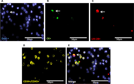 LIN-28- and SOX-2 positive cells were analyzed separately on additional slides of the same patients harboring at least five DTCs as detected by immunocytochemistry using the A45B-B3. Four-fold immunofluorescence staining was established using the OVCAR-3 cell line spiked into blood of healthy donors. Since CD34-positive normal hematopoietic stem cells comprise 1.5% of marrow mononuclear cells [46], we included CD34 in our analysis to exclude false-positive results. CD34 was analysed using the Kasumi-1 cell line since BM of healthy donors was difficult to obtain and only available from one donor (Supplementary Figure 1).