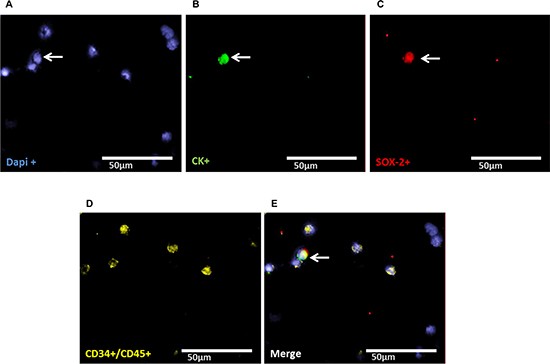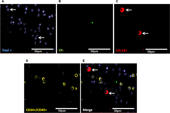 Slides were fixed with 4% Paraformaldehyde for 10 min, permeabilized with 0.1% Triton-X-100 for 15 min and subsequently washed with TBS and Triton-X-100 three times for five min. Slides were stained with SOX-2 (Anti-human SOX-2, 1:50, R & D Systems, USA), LIN-28 (LIN-28, 1:350, Rabbit polyclonal ab46020, Abcam, UK), C11 (anti-PAN-Cytokeratin, 1:400, FITC-labelled, GeneTex, USA), CD34 (Alexa Flour anti-human 647, 1:100, Cy5 labelled, Biolegend, USA) and CD45 (Alexa Fluor 647;sc1178 Santa Cruz, USA) incubated in a wet chamber for one hour at room temperature. Subsequently, slides were incubated with DAPI [pre diluted in Phosphate Buffered Saline (1:250) and further diluted in AB diluent (1:20, Dako, Germany)], and TRITC-labelled donkey anti-goat 594 (SOX-2), donkey anti-rabbit 594 (LIN-28) (both1:100, Invitrogen, USA) under the same conditions followed by three washing steps for five minutes. Moreover, negative controls for primary antibodies were prepared by staining the spiked OVCAR-3 cell line with the secondary antibodies for 30 minutes under the same conditions. The slides were mounted with Dako fluorescent mounting medium s3023 and a coverslip and dried overnight in a cooling chamber. Counting was performed visually, using an immunofluorescence microscope (Axioplan 2 Imaging Zeiss Germany, Metasystems) and Isis Fish imaging system V5.3 (Meta Systems, Germany) at a magnification of 40× or 63×.