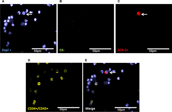 In this study, we also detected CKpos/SOX-2pos (LIN-28pos) as well as CKneg/SOX-2pos (LIN-28pos) cells in all patients. We assume that two different cell types with expression of stem cell associated proteins may have been detected. It has been described that tumor cells undergo phenotypic changes, known as epithelial-mesenchymal transition (EMT), which allow them to migrate to sites of metastasis without being eliminated by conventional treatment [36]. Thus, CKneg/SOX-2pos (Lin-28pos) cells might result from EMT while the CKpos/SOX-2pos (LIN-28pos) epithelial phenotype may have remained unchanged.