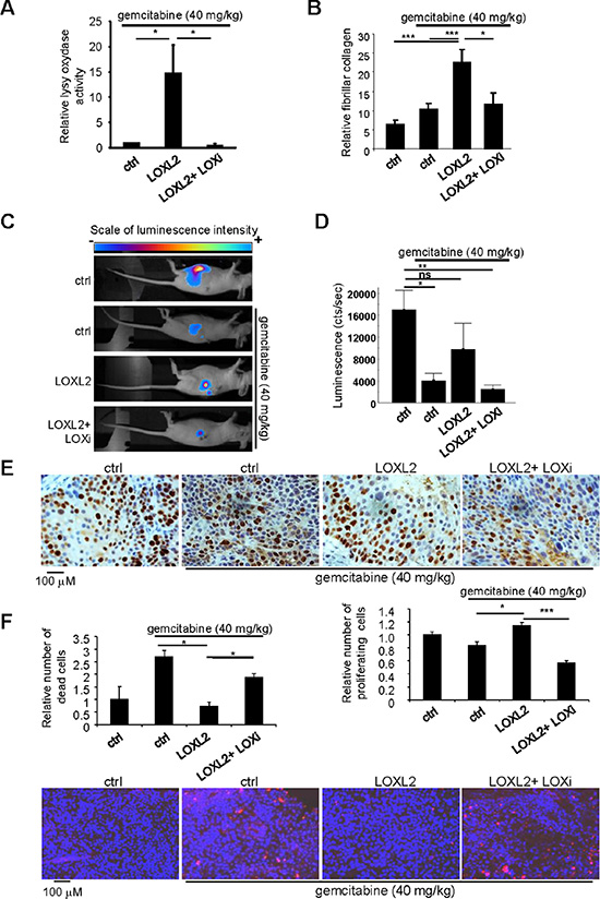 We next performed experiments in which PDAC-derived cells expressing the luciferase gene were orthotopically injected in order to monitor tumor growth in the pancreas. When the tumors reached a mean luminescence of 800 cts/s, gemcitabine at 40 mg/kg was injected alone, with the LOXL2 protein, or with both the LOXL2 protein and the LOX family activity inhibitor (LOXi), to make sure the effect of the LOXL2 protein administered alone was due to its LOX activity. As expected, intraperitoneal LOXL2 injection lead to both, increased LOX family activity and fibrillar collagen, in tumors and, in the same time, co-injection of the LOXi completely prevented these effects (Figure 2A, 2B). In keeping with our results obtained with subcutaneous xenografts (Figure S2), LOXL2 injection prevented the tumor growth slowdown induced by gemcitabine, and LOXi countered this LOXL2-induced resistance to gemcitabine (Figure 2C, 2D).