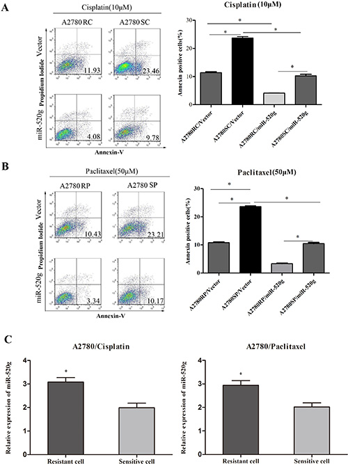 Figure 4: miR-520g increased chemoresistance to cisplatin and paclitaxel. (A) Annexin V/PI staining followed by FACS analysis showed that miR-520g overexpression in A2780 cisplatin resistant (A2780RC) and sensitive (A2780SC) cells increased chemoresistance to cisplatin and inhibited apoptosis (*p < 0.05). (B) miR-520g overexpression in A2780 paclitaxel resistant (A2780RP) and sensitive (A2780SP) cells increased chemoresistance to paclitaxel and inhibited apoptosis (*p < 0.05). (C) miR-520g levels in A2780 cisplatin and paclitaxel resistant/sensitive cell lines (*p < 0.05).