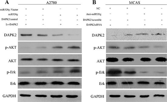 Figure 8: MAPK and AKT pathways promote miR-520g-DAPK2-mediated EOC cell proliferation. (A) Western blot analyses of DAPK2, p-AKT, AKT, p-Erk and Erk in A2780/vector cells and A2780/miR-520g cells transfected with the Lv-DAPK2 or control vectors, respectively. (B) Western blot analyses of DAPK2, p-AKT, AKT, p-Erk and Erk in MCAS/NC cells and MCAS/Anti-miR-520g cells transfected with DAPK2/siRNA or scramble, respectively.