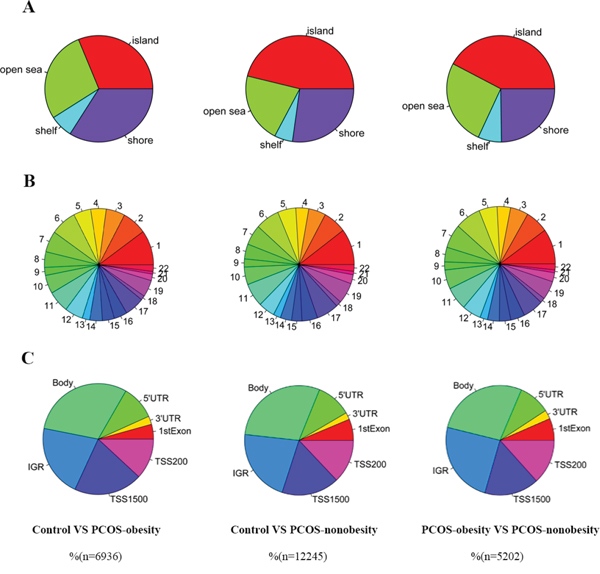 Figure 2: Different DNA methylation CpGs of granulose cells distribution in PCOS-obesity, PCOS-nonobesity and Control. A. CpG content and neighbourhood context of CpG Island, shore, shelf and open sea distribution of different methylation CpG sites B. Different DNA methylation CpGs sites distribution across autosome (chromosome 1 to 22) C. Different DNA methylation CpGs sites gene structure: 5’UTR, 3’UTR, 1stExon, TSS200, TSS1500, IGR and gene body distribution. The number of PCOS-obesity patients was 8, controls were 8 and PCOS-nonobesity was 8.