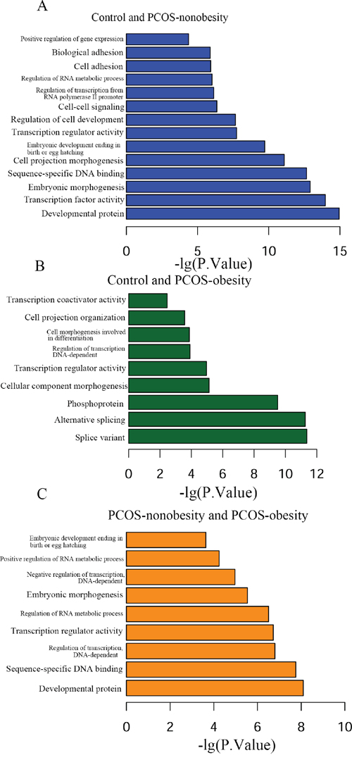 Figure 3: Functional analysis of different methylation sites of PCOS-obesity, PCOS-nonobesity and Control. A. Different methylation sites between control and PCOS-nonobesity functional analysis using DAVID B. Functional analysis of different methylation sites between control and PCOS-obesity using DAVID C. Different methylation sites between PCOS-obesity and PCOS-nonobesity functional analysis using DAVID.