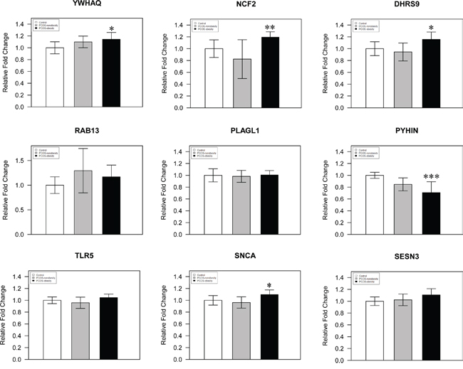 Figure 5: A histogram showing qPCR results of three groups for 9 selected genes. The YWHAQ, NCF2, DHRS9, RAB13, PLAGL1, PYHIN, TLR5, SNCA and SESN3 were analyzed by Q-RT-PCR, using total 24 samples from PCOS-obesity patients, controls and PCOS-nonobesity, each group 8 samples. YWHAQ, DHRS9 and SCNA showed significantly higher in PCOS-obesity patients (P<0.05), NCF2 showed highly significant up-regulation in PCOS-obesity groups(P<0.01), while PYHIN exhibited most significantly down-regulation in PCOS-obesity groups(P<0.001).