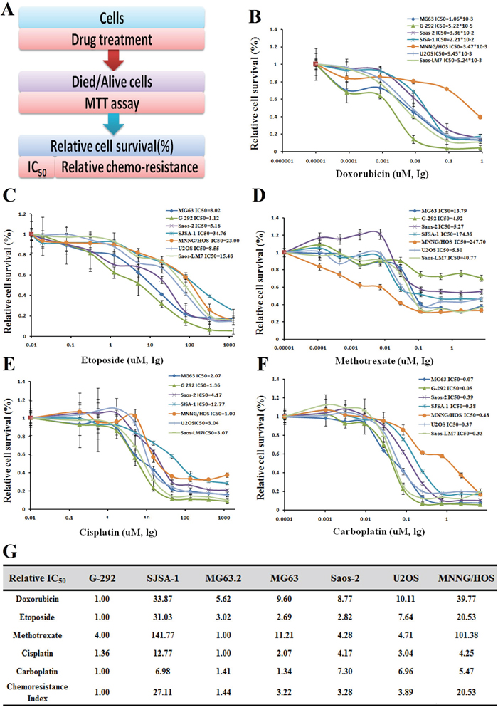 Figure 1: Drug resistance profiling of seven osteosarcoma cell lines. A. Experimental scheme. B-F. IC50 values of the five indicated chemotherapeutics for seven osteosarcoma cell lines. The cell survival rates were calculated as percentages relative to the mock treatment and plotted against lg μM of drug. G. The IC50 (-fold) values relative to those of the most sensitive cell cine (G-292) are presented in the table.