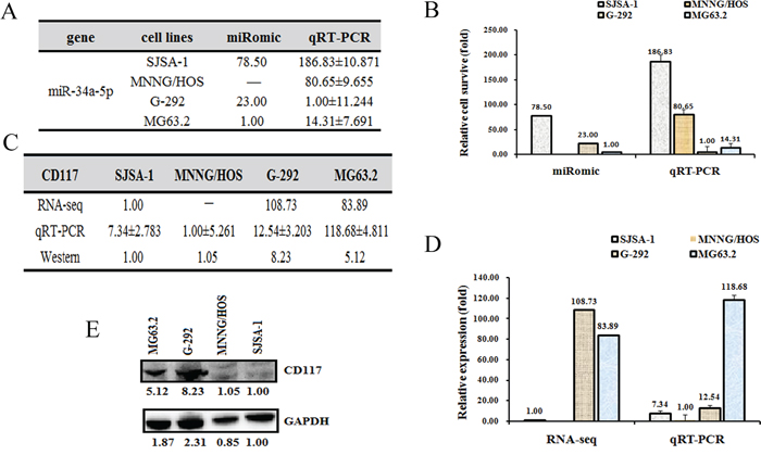 Figure 2: The CD117 level is higher in G-292 and MG63. 2 cells than in SJSA-1 and MNNG/HOS cells. The relative miR-34a-5p level (fold) in G-292 and MG63.2 cells versus SJSA-1 and MNNG/HOS cells measured by both miR-omic and qRT-PCR analyses is shown in a table A. and those measured by qRT-PCR are shown in a plot B. The relative level (fold) of the CD117 gene in G-292 and MG63.2 cells versus SJSA-1 and MNNG/HOS cells are summarized in a table C., with a plot showing the miR-omic and qRT-PCR analyses D. and a figure showing the western blot analysis E. “-” indicates no detection in the omic analysis.