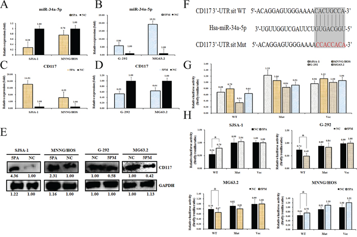 Figure 3: CD117 is a direct target of miR-34a-5p in osteosarcoma cells. Level of miR-34a-5p A and B. CD117 mRNA C and D. and protein E. levels in the miR-34a-5p mimic (5PM)-transfected G-292 and MG63.2 cells and the miR-34a-5p antagomiR (5PA)-transfected SJSA-1 and MNNG/HOS cells versus the negative control (NC) cells, as determined by qRT-PCR or western blot analyses. Sequences in the UTR region of the CD117 gene targeted by miR-34a-5p, with the hatched section showing the combined area F. The relative luciferase activities (fold) of the reporter with the wild-type (WT) or mutant-type (Mut) CD117-UTR or without the UTR (Vec) were determined in the osteosarcoma cells transfected with the miR-34a-5p mimic (in G-292 and MG63.2), antagomiR (in SJSA-1 and MNNG/HOS) or Mock G and H. sequences. The Renilla luciferase activity of a co-transfected control plasmid was used as a control for the transfection efficiency. The representative results from three independent experiments are shown. *P value<0.05 by Student’s t-test.