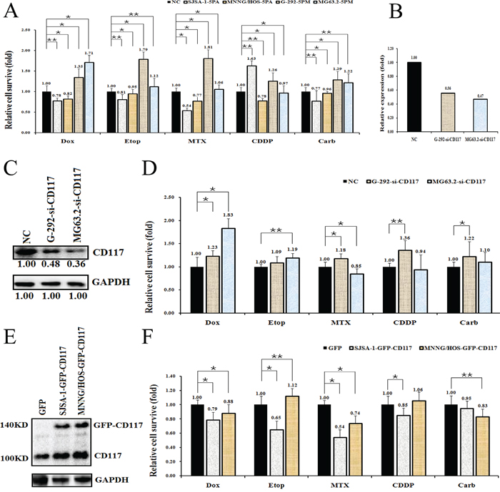 Figure 4: Effects of a forced reversal of the miR-34a-5p or CD117 levels on the drug resistance of G-292 and SJSA-1 cells. Cell death triggered by an IC50 dose of drug in G-292, MG63.2, SJSA-1 and MNNG/HOS cells transfected with a miR-34a-5p mimic (5PM) or antagomiR (5PA) versus the negative control (NC) assayed 72 hr after treatment with the IC50 dose of drugs A. Levels of CD117 mRNA determined by qRT-PCR in the siRNA-transfected G-292 and MG63.2 cells versus the NC-transfected cells B. CD117 protein level (western blot analysis) in the siRNA-transfected versus the NC-transfected G-292 and MG63.2 cells C. Cell survival of the G-292 and MG63.2 cells transfected with siRNA relative to that of the NC-transfected G-292 and MG63.2 cells 72 hr after a treatment with the IC50 dose of drugs D. CD117 protein level (western blot analysis) in the GFP-tagged overexpression construct-transfected versus the NC-transfected SJSA-1 and MNNG/HOS cells E. Cell survival of the SJSA-1 and MNNG/HOS cells transfected with miR-34a-5p antagomiR (5PA) relative to that the NC-transfected SJSA-1 cells assayed 72 hr post-treatment with the IC50 dose of drugs F. *P value < 0.05; **P value < 0.01.