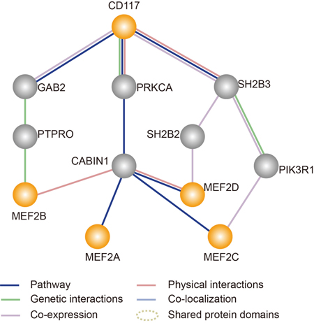 We searched for candidate interactions that could connect CD117 with the master transcription factor, MEF2 (Figure 7), using GeneMANIA [23]. In total, 18 interacting genes of CD117 were found in both GeneMANIA and the UniHI database [24]. Additional data mining was used to build a potential connection network describing the series of interactions (Figure 7). In this working model, the CD117 gene regulates the MEF2 signaling pathway via an interaction with three genes, GAB2, PRKCA and SH2B3.