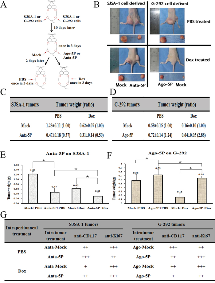 Figure 8: Effect of miR-34a-5p on the in vivo growth and Dox drug resistance of SJSA-1 and G-292-derived xenografts in nude mice. A., Experimental scheme: SJSA-1 or G-292 cells were subcutaneously injected at two points on the back of each nude mouse, with 2 sites/mouse, 6 mice for SJSA-1, and 6 mice for G-292. From the 10th day after cell injection, all six SJSA-1-generated tumors on the left back of the nude mice were intratumorally injected with 2 nM miR-34a-5p antagomiR, and the six right back sites were injected with 2 nM Mock; G-292-generated tumors on the left back of the nude mice were injected with 4Nm miR-34a-5p agomiR, and the six right sites were injected with 4 nM Mock; this process was repeated five times within 3 days. From the 25th day after cell injection, 3 SJSA-1 mice and 3 G-292 mice received Dox (2.5 mg/kg) intraperitoneally once every 3 days, for a total of 4 injections over 12 days. The remaining 6 mice (3 from SJSA-1 and 3 from G-292) received PBS as a mock treatment control. B., Image of representative mice with tumors on day 40. C., D., E and F., The mean ± SD of the tumor weight of the tumor for the same treatment was calculated, plotted (*, P value< 0.05), and summarized. G., The protein levels of CD117 and Ki67 in each group were determined by immunostaining and summarized in the table (Magnification: 200×).