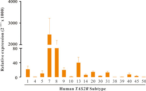 Using quantitative reverse transcription PCR (RT-qPCR), we screened the expression profile of all 25 TAS2R genes in human DSM. As shown in Figure 1, we found that TAS2R7 and TAS2R8 were the most abundantly expressed genes, with levels similar to the reference gene glyceraldehyde 3-phosphate dehydrogenase (GAPDH). The expression levels of TAS2R1, TAS2R5, TAS2R9, TAS2R13, TAS2R20, and TAS2R31 were two orders of magnitude lower than that of GAPDH with the following rank order: TAS2R13 > TAS2R1≈TAS2R9 > TAS2R5≈TAS2R20≈TAS2R31. TAS2R4, TAS2R10, TAS2R14, TAS2R30, TAS2R38, TAS2R39, TAS2R40, TAS2R45, and TAS2R50 were very slightly detected. Eight TAS2R genes (TAS2R3, TAS2R16, TAS2R19, TAS2R41, TAS2R42, TAS2R43, TAS2R46, and TAS2R60) were not expressed.
