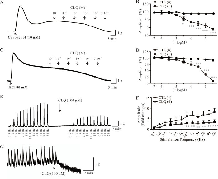 Figure 2: Effect of chloroquine on stimulus-induced and spontaneous contractions of human DSM strips. A., B. Original trace and summary data showing the effects of vehicle (control, n = 4 strips) or chloroquine (CLQ: 100 nM to 3 mM; n = 5 strips) on carbachol-induced contractions. C., D. Original trace and summary data showing the effects of vehicle (control, n = 4 strips) or CLQ (100 nM to 3 mM; n = 5 strips) on KCl-induced contractions. E., F. Original trace and summary data showing the effects of CLQ (100 µM) on EFS-induced contractions (n= 4 strips). G. Original trace of spontaneous contractions in the absence and presence of 100 µM CLQ. Data are mean ± SEM of n independent DSM strips. *p < 0.05, **p < 0.01, and***p < 0.001 as indicated.