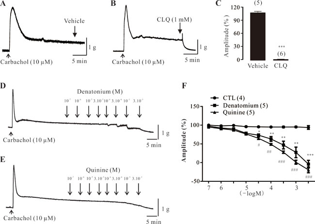 Figure 4: Effect of bitter tastants on carbachol-induced contractions of mouse DSM strips. A.-C. Original traces and summary data showing the effects of vehicle (control, n = 5 strips) or chloroquine (CLQ: 1 mM; n = 6 strips) on carbachol-induced contractions in mouse DSM strips. D. Original trace showing the effects of denatonium (100 nM to 3 mM) on carbachol-induced contractions. E. Original trace showing the effects of quinine (100 nM to 3 mM) on carbachol-induced contractions. F. Summary data showing the effects of vehicle, denatonium (n = 5 strips), and quinine (n = 5 strips) on carbachol-induced contractions. Data are mean ± SEM of n independent mouse DSM strips. *p < 0.05, **p < 0.01, and ***p < 0.001 were control vs. CLQ or denatomium; #p < 0.05, ##p < 0.01, and ###p < 0.001 were control vs. quinine, respectively.