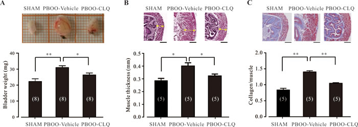 Figure 5: Chloroquine treatment significantly attenuates the bladder morphological changes of PBOO mice. A. Bladder weights of the sham (N = 8), PBOO-Vehicle (N = 8), and PBOO-CLQ (N = 8) mice are shown. After anesthesia, the whole bladder was removed and imaged. The fat and connective tissues were cleaned under cold PBS. Then, the bladder was cut from the neck to the fundus along one side. After being quickly dried by drinking paper, the bladder was weighed. B. The representative HE stains of bladder specimens from the sham, PBOO-Vehicle, and PBOO-CLQ mice are shown. Summary data showing the average muscle thickness of bladders from the sham (N = 5), PBOO-Vehicle (N = 5), and PBOO-CLQ (N = 5) mice. C. The representative Masson’s trichrome staining of bladder from the sham, PBOO-Vehicle, and PBOO-CLQ mice were shown. Summary data showing the mean ratio of collagen to muscle from the sham (N = 5), PBOO-Vehicle (N = 5), and PBOO-CLQ (N = 5) mice. Scale bars = 250 µm. *p < 0.05 and **p < 0.01 as indicated.