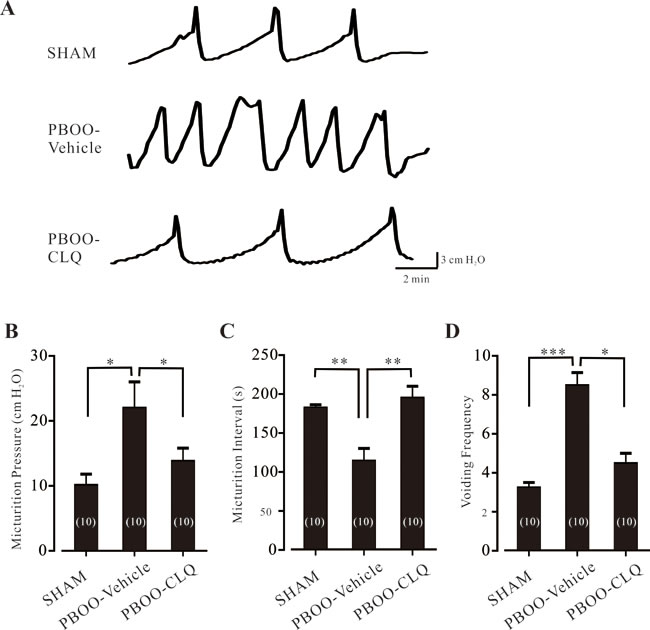 Figure 6: Chloroquine treatment improves the bladder function of PBOO mice. A. The representative traces of the cystometrogram recorded in the sham, PBOO-Vehicle, and PBOO-CLQ mice. B.-D. Summary data of micturition pressures, micturition intervals, and voiding frequency of the sham (N = 10), PBOO-Vehicle (N = 10), and PBOO-CLQ (N = 10) mice are shown. Data are mean ± SEM. *p < 0.05, **p < 0.01, and ***p < 0.001 as indicated.