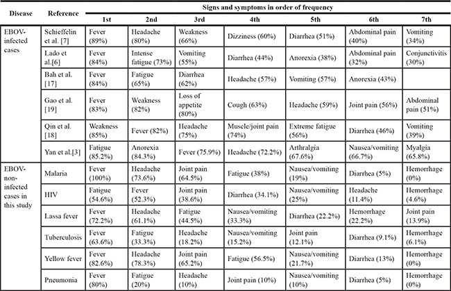 Examination of EBOV-uninfected individuals for non-EVD illnesses was performed using different methods. Among the 278 EBOV-negative subjects, 121 (43.5%), 44 (15.6%), 36 (13.1%), 33 (11.7%), 23 (8.4%), and 10 (3.7%) were diagnosed with malaria, HIV, Lassa fever, tuberculosis, yellow fever, and pneumonia, respectively. Eleven patients remained undiagnosed (Table 1), which implied the possibility that fever of the patients were caused by non-infectious diseases. Table 2 lists the most common symptoms reported in EBOV-negative patients. Although no statistical analysis was performed, the clinical features of patients with non-EBV illness compared with EBOV infection seems to have no significant difference.
