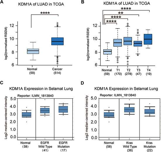 Figure 1: KDM1A is significantly up-regulated in NSCLC. (A) KDM1A expression in normal lung tissue (Normal) and NSCLC (Cancer) (data from lung Adenocarcinoma (LUAD) of the TCGA database). The log2 fold change and p value of KDM1A expression are: 0.68 (p = 5.01E-5, Cancer vs. Normal). (B) KDM1A expression in normal lung tissue (Normal) and all stages (T1, T2, T3, and T4) of LUAD (data from the TCGA database). Log2 fold changes and p values of KDM1A expression are: 0.58 (p = 0.00036, T1 vs. Normal), 0.75 (p = 1.12E-5, T2 vs. Normal), 0.57 (p = 0.003, T3 vs. Normal), and 0.95 (p = 0.00012, T4 vs. Normal). (C) KDM1A expression in normal lung tissue and NSCLC patients with either a wild type or mutant EGFR gene in the Selamat Lung dataset (data from the Oncomine database). (D) KDM1A expression in normal lung tissue and NSCLC patients with either a wild type or mutant Kras gene in the Selamat Lung dataset (data from the Oncomine database). Reporter stands for the probe name used in the experiments. The number in the parenthesis represents the sample size.