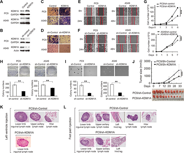 Figure 2: KDM1A promotes tumor growth and metastasis in NSCLC. (A, B) Validation of KDM1A overexpression (A) and knockdown (B) in PC9 and A549 cells by WB. GAPDH serves as a loading control. (C) Invasion capacities of PC9 or A549 cells transfected with either the control plasmid (Control) or KDM1A overexpression plasmid (KDM1A). (D) Invasion capacities of PC9 or A549 cells stably expressing the control shRNA (sh-Control) or KDM1A shRNA (sh-KDM1A). (E) Migration capacities of PC9 or A549 cells transfected with either the control plasmid (Control) or KDM1A overexpression plasmid (KDM1A). (F) Migration capacities of PC9 or A549 cells stably expressing the control shRNA (sh-Control) or KDM1A shRNA (sh-KDM1A). The red line indicates the edge of migrating cells at a given time point. (G, H, I) PC9 or A549 cells stably expressing the control shRNA (sh-Control) or KDM1A shRNA (sh-KDM1A) were subjected to: cell proliferation assay at different time points (0, 1, 3, 5, 6 or 7 days) (G), colony formation assay (H), or anchorage-independent colony formation assay in soft agar (I). Bar graphs show the quantification of colony number in each condition. (J) Growth curve of xenograft tumors derived from PC9 cells stably expressing the control shRNA (sh-Control) or KDM1A shRNA (sh-KDM1A) (upper panel). After approximately 5 weeks, xenograft tumors were dissected and photographed (lower panel). Each group contained 10 or 11 mice. (K, L) H&E-stained images of metastatic nodes in the mice left ventricle injection and foot pad injection experiments. (K) For the left ventricle injection experiments: in the mice injected with PC9 cells stably expressing the control shRNA (PC9/sh-Control), metastatic nodes were found in the lower inguinal, upper axillary, and hilar lymph nodes, but in the mice injected with PC9 cells stably expressing KDM1A shRNA (PC9/sh-KDM1A), metastatic nodes were found only in the lower inguinal and not in other lymph nodes. (L) For the foot pad injection experiments: in the mice with PC9/sh-Control, metastatic nodes were found in the lower inguinal, upper axillary, neck, and hilar lymph nodes, as well as in the left hind leg; but in the mice with PC9/sh-KDM1A, metastatic nodes were found only in the lower inguinal and upper axillary lymph nodes, and in the left hind leg, but not in other parts.