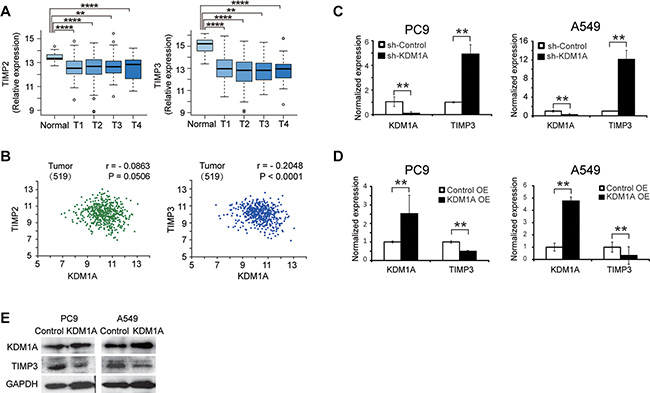 Figure 3: TIMP3 expression is negatively correlated with KDM1A in NSCLC, and is repressed by KDM1A. (A) Comparison of the relative expression of TIMP2 and TIMP3 in different tumor stages (T1, T2, T3, and T4) of NSCLC patients compared to non-tumor control (normal) (data from LUAD of the TCGA database). Log2 fold changes in TIMP2 expression are: –0.78 (p = 6.87E-10, T1 vs. Normal), –0.67 (p = 1.98E-6, T2 vs. Normal), –0.44 (p = 0.0076, T3 vs. Normal), and –0.56 (p = 0.024, T4 vs. Normal). Log2 fold changes in TIMP3 expression are: –1.88 (p = 5.43E-42, T1 vs. Normal), –2.02 (p = 2.89E-47, T2 vs. Normal), –2.06 (p = 1.26E-28, T3 vs. Normal), and –1.53 (p = 1.56E-10, T4 vs. Normal). (B) Correlation analysis between KDM1A and TIMP2 expressions (left panel), or between KDM1A and TIMP3 expressions (right panel) in tumors (data from LUAD of the TCGA database). Correlation coefficient (r) and P value (P) are calculated. Numbers within the parentheses represent the sample size. (C, D) Normalized KDM1A and TIMP3 expressions in PC9 or A549 cells expressing the control shRNA (sh-Control) or KDM1A shRNA (sh-KDM1A) (C), or PC9 or A549 cells transfected with either the control (Control OE) or KDM1A overexpression plasmid (KDM1A OE) (D), detected by real-time RT-PCR. Each condition was performed in triplicates. Data are represented as mean (SD). (E) WB detection of KDM1A and TIMP3 expressions in PC9 or A549 cells transfected with either the control (Control) or KDM1A overexpression plasmid (KDM1A). GAPDH serves as a loading control.