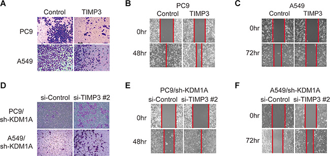Figure 4: TIMP3 suppresses KDM1A-mediated cell invasion and migration. (A, B, C) PC9 or A549 cells transfected with either the control plasmid (Control) or TIMP3 overexpression plasmid (TIMP3) were subjected to cell invasion assay (A) and cell migration assays (B, C). (D–F) PC9 or A549 cells stably expressing KDM1A shRNA (sh-KDM1A) were transfected with either the control siRNA (si-Control) or TIMP3 siRNA (si-TIMP3 #2), and subjected to cell invasion assay (D) and cell migration assays (E, F). The red line indicates the edge of migrating cells at a given time point.