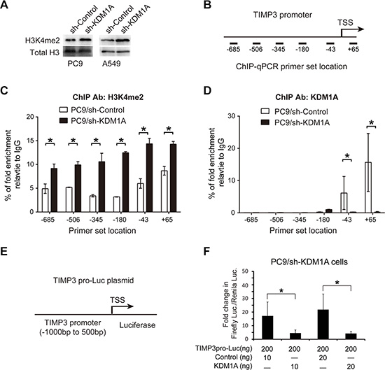 Figure 5: KDM1A removes H3K4me2 at the TIMP3 promoter and represses its promoter activity. (A) WB detection of the H3K4me2 level in PC9 and A549 cells expressing the control shRNA (sh-Control) or KDM1A shRNA (sh-KDM1A). Total histone H3 serves as a loading control. (B) Schematic drawing of the TIMP3 promoter region and ChIP-qPCR primer set locations (–685, –506, –345, –180, –43, and +65), relative to the TSS (transcriptional start site). TSS is assigned as the “+1” position. (C, D) ChIP-qPCR was performed in PC9 cells expressing the control shRNA (sh-Control) or KDM1A shRNA (sh-KDM1A) using an anti-H3K4me2 antibody (C) or an anti-KDM1A antibody (D). Bar graphs show percentages of fold enrichment of H3K4me2 (C) or KDM1A (D) at different locations of the TIMP3 promoter region, relative to IgG immunoprecipitation. (E) Schematic drawing of the TIMP3 promoter luciferase reporter construct (TIMP3pro-Luc plasmid). TIMP3 promoter region spanning from –1000 bp to 500 bp with respect to the TSS was cloned into luciferase reporter vector (pGL3). (F) TIMP3pro-Luc plasmid was co-transfected with either KDM1A overexpression plasmid (KDM1A) or the control plasmid (Control) into PC9 cells stably expressing KDM1A shRNA, and relative luciferase activity was measured 72 hours later. Each condition was performed in six replicates. Data are represented as mean (SD).