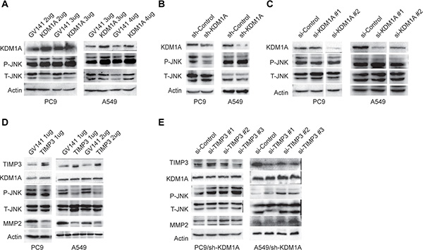 Figure 6: JNK phosphorylation is enhanced by KDM1A overexpression, but repressed by TIMP3 overexpression. (A) PC9 or A549 cells transfected with either the control (GV141) or KDM1A overexpression plasmid (KDM1A) at given amounts (2, 3, or 4 μg) were subjected to WB, to detect the following protein expressions: KDM1A, total and phosphorylated JNK (T- and P-JNK). (B, C) PC9 or A549 cells stably expressing the control shRNA (sh-Control) or KDM1A shRNA (sh-KDM1A) (B), or PC9 or A549 cells transiently transfected with the control siRNA (si-Control) or two different KDM1A siRNA (si-KDM1A #1, #2) (C), were subjected to WB, to detect the following protein expressions: KDM1A, total and phosphorylated JNK. Images of WB detection for KDM1A and Actin in A549 cells (sh-Control and sh-KDM1A) was also shown in Figure 2B. (D) PC9 or A549 cells transfected with either the control (GV141) or TIMP3 overexpression plasmid (TIMP3) at given amounts (1, or 2 μg) were subjected to WB, to detect the following protein expressions: TIMP3, KDM1A, T- and P-JNK, and MMP2. (E) PC9 or A549 cells stably expressing the control shRNA (sh-Control) or KDM1A shRNA (sh-KDM1A) were transfected with either the control siRNA (si-Control) or three different TIMP3 siRNA (si-TIMP3 #1, #2, #3), were subjected to WB, to detect the following protein expression: TIMP3, KDM1A, T- and P-JNK, and MMP2. Actin serves as a loading control.