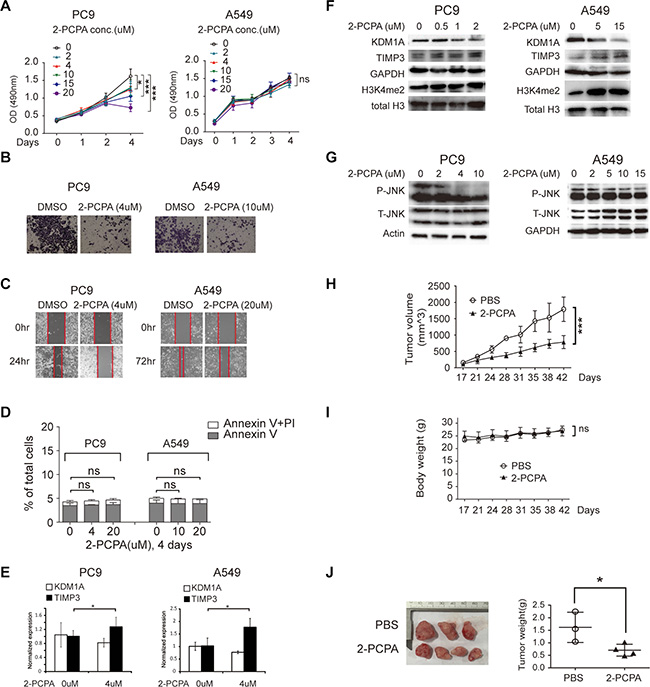 Figure 7: 2-PCPA treatment inhibits cell proliferation, invasion, and migration in NSCLC cells. (A) PC9 and A549 cells were treated with 2-PCPA at various concentrations (0, 2, 4, 10, 15, 20 μM), and subjected for cell proliferation assay, at given time points (0, 1, 2, 3, or 4 days). (B, C) PC9 and A549 cells were treated with either DMSO or 2-PCPA (4, 10, or 20 μM), and subjected to cell invasion assay (B), and cell migration assays (C). The red line indicates the edge of migrating cells at a given time point. (D) PC9 and A549 cells were treated with either DMSO or 2-PCPA (4, 10, or 20 μM), and subjected to cell apoptosis assay using BD Annexin V FITC kit. The bar graph represents percentages of cells expressing early (Annexin V) or late (PI) apoptosis markers. (E) Normalized KDM1A and TIMP3 expressions in PC9 and A549 cells treated with 0 or 4 μM 2-PCPA for 2 days, detected by real time RT-PCR. Each condition was performed in triplicates. Data are represented as mean (SD). (F-G) PC9 and A549 cells were treated with 2-PCPA at various concentrations (0, 0.5, 1, 2, 5, and 15 μM (F), and 0, 2, 4, 5, 10, and 15 μM (G), and subjected to WB, to detect the following protein expressions: KDM1A, TIMP3, H3K4me2 (F), P-JNK, and T-JNK (G). GAPDH, Actin, and total histone H3 serve as loading controls. (H, I,) Growth curve of PC9 cells derived xenograft tumors (H) and mice body weight (I) with either PBS (control) or 2-PCPA treatment. (J) Image of dissected xenograft tumors (left panel). Tumor weight comparison of two treatment groups by t test (right panel).