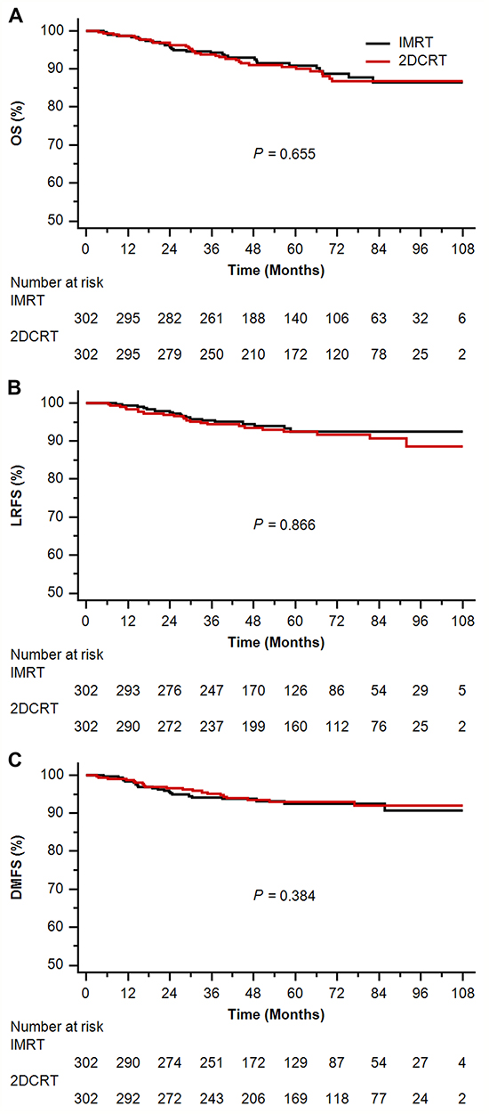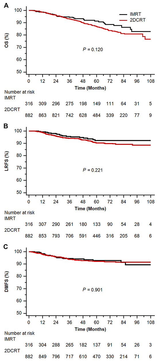 Figure 2: Kaplan-Meier survival curves of intensity-modulated radiotherapy (IMRT) arm versus two-dimensional conventional radiotherapy (2DCRT) arm in the propensity-matched cohort. A. overall survival (OS); B. locoregional relapse-free survival (LRFS); C. distant metastasis-free survival (DMFS).