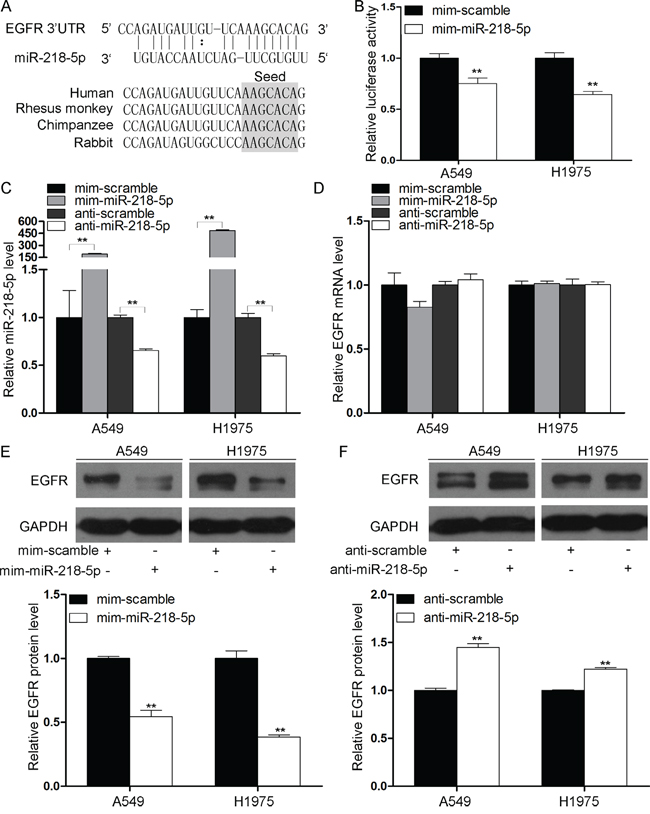 Previous studies have demonstrated that miR-218-5p functions as a tumor suppressor in many cancers [15–19], but its targets in NSCLC are largely unknown. Here, we used a bioinformatics method (http://www.targetscan.org) to predict the target genes that miR-218-5p may bind to. From all of the candidates, we selected EGFR as a potential target because EGFR plays an important role in NSCLC development. As shown in Figure 1A, a predicted hybridization was identified between miR-218-5p and the 3’-UTR of EGFR. Furthermore, the miR-218-5p binding sequence in the EGFR 3’-UTR was highly conserved across species (Figure 1A). To confirm whether miR-218-5p could bind to EGFR, a luciferase reporter assay was performed. The 3’-untranslated region (3’-UTR) of EGFR was fused downstream of the firefly luciferase gene in a reporter plasmid, and the recombination plasmid was transfected into NSCLC cell lines A549 and H1975 along with an miR-218-5p mimic. The miR-218-5p mimic was transfected into cells to induce the overexpression of miR-218-5p, and a scrambled mimic was simultaneously transfected into cells as a negative control. As expected, the luciferase activity was remarkably reduced in the cells that were co-transfected with the luciferase reporter plasmid and the miR-218-5p mimic (Figure 1B).