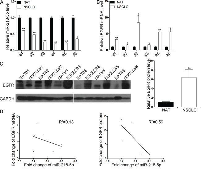 Figure 2: Inverse correlation between the miR-218-5p and EGFR protein expression levels in NSCLC tissues. A. Quantitative RT-PCR analyses of the expression levels of miR-218-5p in 6 pairs of NSCLC and NAT samples. The results were normalized to U6 (*P < 0.05, **P < 0.01). B. Quantitative RT-PCR analyses of the expression levels of EGFR mRNA in 6 pairs of NSCLC and NAT samples. The results were normalized to GAPDH (*P < 0.05, **P <0.01). C. Western blotting analyses of the expression levels of EGFR protein in 6 pairs of NSCLC and NAT samples. Left panel: representative image; right panel: quantitative analysis (**P < 0.01). D. Pearson’s correlation scatter plot of the fold change in miR-218-5p and EGFR mRNA (left) or protein (right) in human NSCLC tissues.