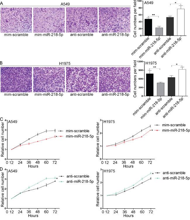 Figure 3: miR-218-5p inhibits the migration and proliferation of NSCLC cells in vitro. A and B. Transwell analyses of the migrated A549 (A) and H1975 (B) cells transfected with the miR-218-5p mimic, scrambled mimic, antisense miR-218-5p or scrambled antisense miRNA. A549 cells were allowed to migrate for 6 h and H1975 cells were allowed to migrate for 12 h. Left panel: representative images showing cells that migrated through the filter; right panel: cell numbers counted in each field (*P < 0.05; **P < 0.01). C and D. CCK8 analyses of the proliferation rates of the A549 (C) and H1975 (D) cells transfected with the miR-218-5p mimic, scrambled mimic, antisense miR-218-5p or scrambled antisense miRNA (*P <0.05).