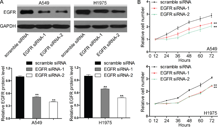 Figure 4: Effects of EGFR knockdown on the proliferation of NSCLC cells. A. Western blotting analyses of the expression levels of the EGFR protein in the A549 and H1975 cells transfected with scrambled siRNA or EGFR siRNAs (EGFR siRNA-1 and EGFR siRNA-2). Upper panel: representative images; lower panel: quantitative analysis (**P < 0.01). B. CCK8 analyses of the proliferation rates of the A549 (upper) and H1975 (lower) cells transfected with scrambled siRNA or EGFR siRNAs (**P < 0.01).
