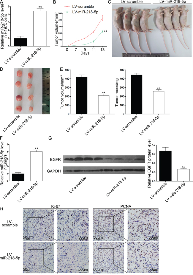 Figure 5: Effects of miR-218-5p on the growth of NSCLC xenografts in mice. H1975 cells were infected with a control lentivirus or a lentivirus causing the overexpression of miR-218-5p. The infected H1975 cells (5 × 106 cells per mouse) were implanted subcutaneously into nude mice (10 mice per group). Beginning on day 7 after implantation, the tumor lengths and widths were measured every 2 days for a total of 4 measurements, and the tumor growth curves were evaluated. At 13days after implantation, the tumors were dissected, and the exact sizes and weights were measured. A. Quantitative RT-PCR analyses of the miR-218-5p levels in the H1975 cells after infection with a control lentivirus or a lentivirus causing the overexpression of miR-218-5p (**P < 0.01). B. Tumor growth curves in the implanted mice (**P < 0.01). C and D. Representative images of the nude mice bearing xenograft tumors (C) and the excised tumors (D). E. Quantitative analyses of the tumor volumes and weights (**P < 0.01). F. Quantitative RT-PCR analyses of the miR-218-5p levels in the tumors from the implanted mice (**P < 0.01). G. Western blotting analyses of the EGFR protein levels in the tumors from the implanted mice. Left panel: representative images; right panel: quantitative analysis (**P < 0.01). H. Immunohistochemical staining analyses of Ki-67 and PCNA in the tumors from the implanted mice.
