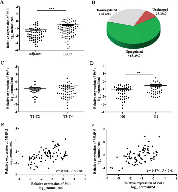 Our previous studies demonstrated that Pol ι is highly expressed in ESCC tissues compared to adjacent normal tissues [22]. To further confirm this observation, the expression of Pol ι mRNA was examined with qRT-PCR in an expanded cohort of 82 ESCC tissue samples and 60 matched adjacent normal esophageal tissue samples. As shown in Figure 1A and 1B, Pol ι expression was significantly increased in ESCC tissues (63.3%) compared with adjacent normal esophageal tissues (p<0.001). Lymph node metastasis has been characterized as the single most important prognostic factor for esophageal cancer [23]. Our results revealed that the expression of Pol ι is significantly higher in ESCCs with lymph node metastasis than those without lymph node metastasis (p<0.01, Figure 1D), although the expression level is not correlated with T stages (p>0.05, Figure 1C).