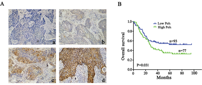 Figure 2: Pol ι expression correlates with poor prognosis in human ESCC. A. immunohistochemical staining of Pol ι in 170 tumor tissue samples (100×), a: Negative expression; b, Low expression; c, Moderate expression; d, High expression. B. survival analysis based on the expression level of Pol ι. The groups were ranked according to the Pol ι staining intensity. The percentages of overall survival in low Pol ι expression (A, a-b) was significantly higher than that of patients with high Pol ι expression (A, c-d) (p=0.031).