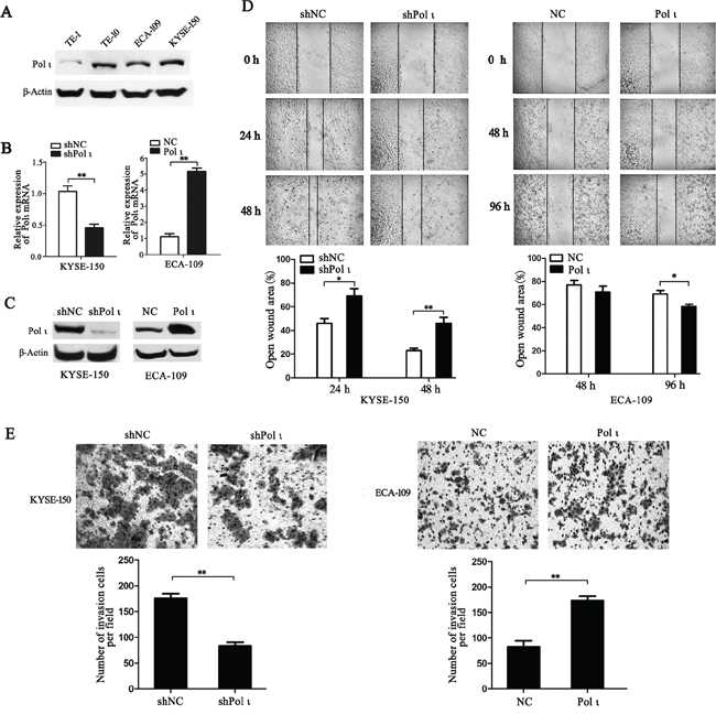 Figure 3: Pol ι promotes ESCC cell migration and invasion in vitro. A. western blot was performed to detect the expression of Pol ι in four ESCC cell lines. B-C. Pol ι overexpression and knockdown cell lines were constructed using LV-EGFP vectors. qRT-PCR (B) and western blot (C) were used to analyze Pol ι expression in these cell lines.β-actin levels served as loading control. D. the wound-healing assay was performed to examine the cell migration. Cells were seeded in 6-well plates that reached confluence in 24 h. Wound healing was measured at 0, 24, 48 and 96h after scratch. The open wound area was normalized to the area at the initial time (0 h). Pol ι knockdown repressed the cell migration of KYSE-150 cells, whereas overexpression of Pol ι enhanced the cell migration of ECA-109 cells (*p < 0.05, **p<0.01, Student’s t test). E. The matrigel transwell assay was performed to determine cell invasion potential. 1x105 cells were plated in transwell inserts and incubated for 24 or 48 h. Cells migrated to the bottom were stained with crystal violet and calculated manually. Pol ι knockdown repressed the cell invasion of KYSE-150 cells, and overexpression of Pol ι enhanced the cell invasion of ECA-109 cells (**p<0.01, Student’s t test).